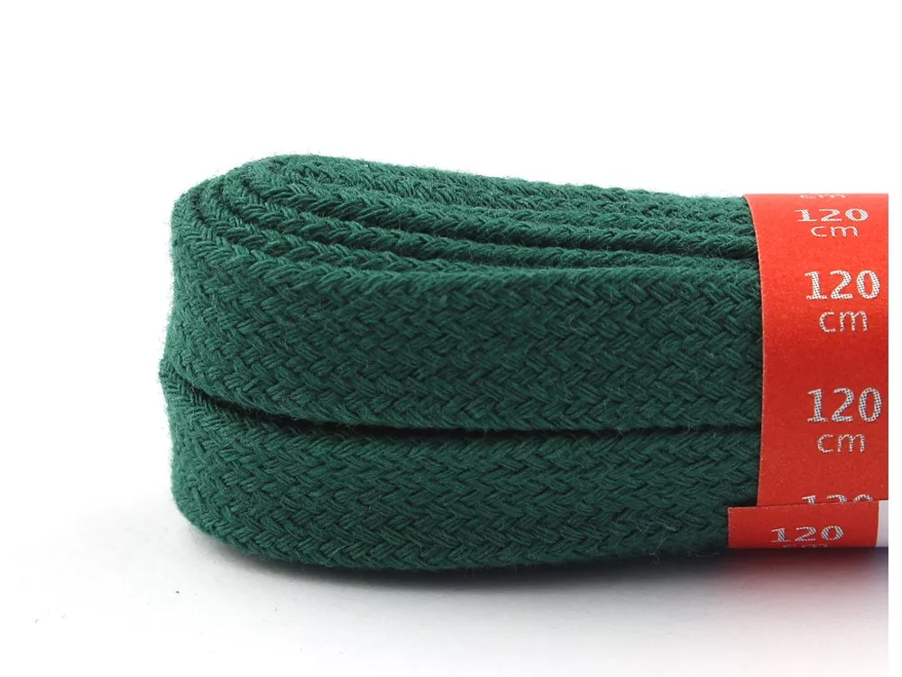 Les lacets plats en coton vert foncé d'une longueur de 120 cm, convenant aux baskets basses et de 160 cm, convenant aux baskets à la cheville.