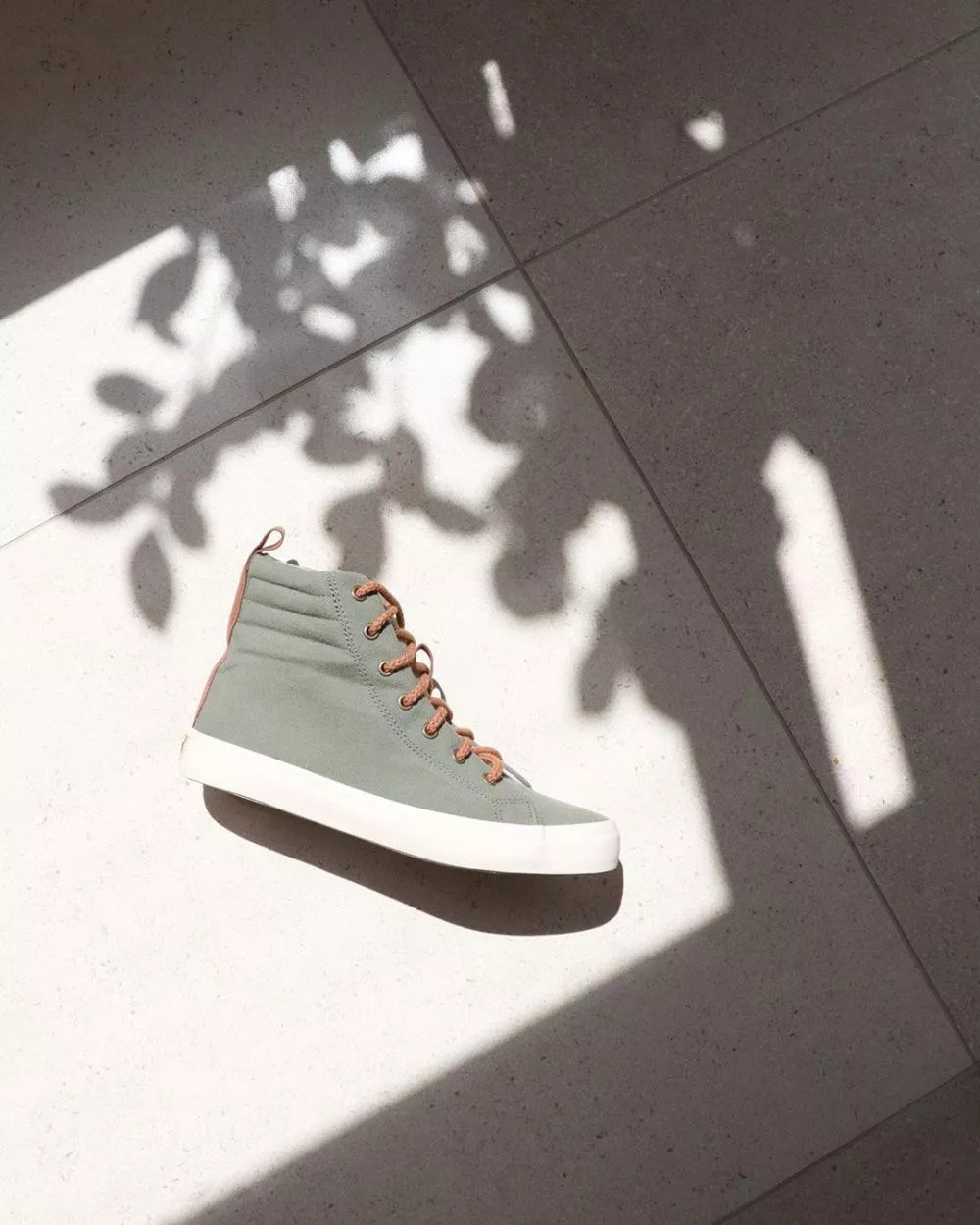 Musgo Classicos Perky confortable et kaki avec rembourrage au-dessus des chevilles en tailles femme et homme. Le tissu est fabriqué à partir de déchets et de bouteilles PET recyclées, ce qui place ces baskets dans la collection des produits écologiques. Les matériaux synthétiques utilisés rendent les baskets végétaliennes.