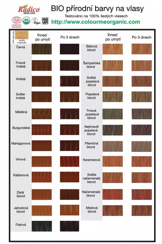 Les couleurs naturelles ne peuvent pas changer la couleur des cheveux de plusieurs tons. La raison en est qu'elles ne pénètrent pas profondément dans le cheveu, contrairement aux colorations chimiques, mais enrobent sa surface. Cela crée une fine couche de couleur qui s'intensifie avec une utilisation fréquente. La teinte finale dépend donc de votre couleur de cheveux d'origine, de leur condition et de leurs caractéristiques. La coloration naturelle est semblable à l'alchimie – chacun de nous est unique, et ainsi la poudre colorante issue de plantes peut réagir différemment selon les personnes. La principale différence réside dans le fait que la couleur 100 % naturelle ne nuit pas aux cheveux et son utilisation est totalement sûre et illimitée. Outre l'effet colorant, elle a aussi des effets régénérateurs prononcés. Grâce à elle, les cheveux gagnent en force, nutrition, brillance et seront agréablement doux au toucher.